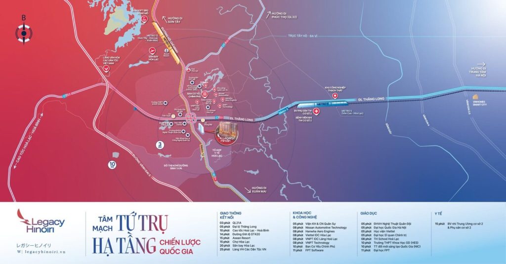 Legacy Hinoiri tọa lạc tại tâm mạch tứ trụ hạ tầng chiến lược quốc gia – điểm kết nối giao thương, khoa học công nghệ, giáo dục và y tế. Vị trí này mở ra giá trị sống – đầu tư – thịnh vượng không giới hạn cho những chủ nhân tinh hoa.